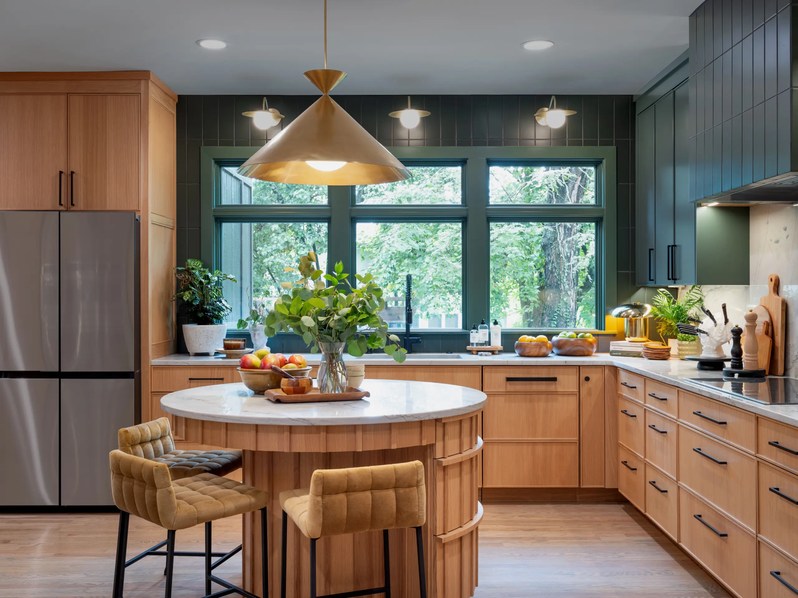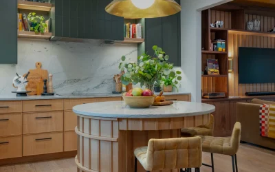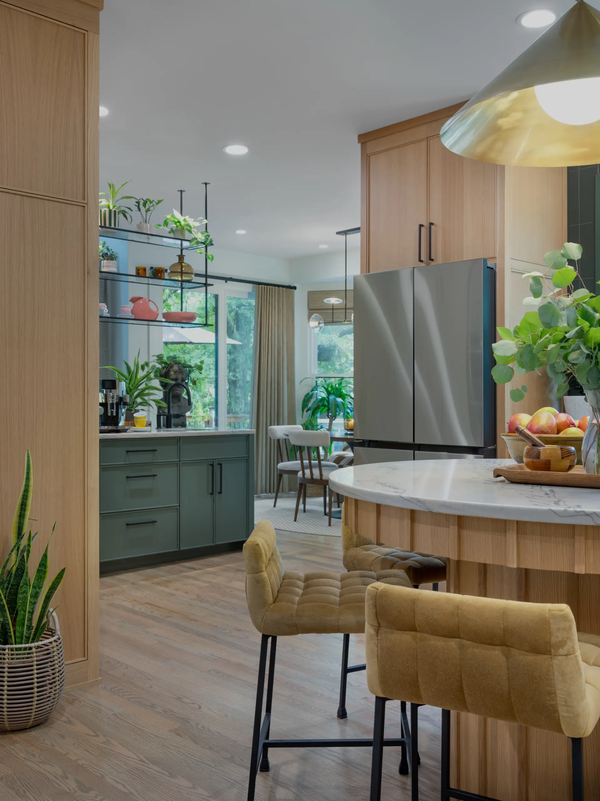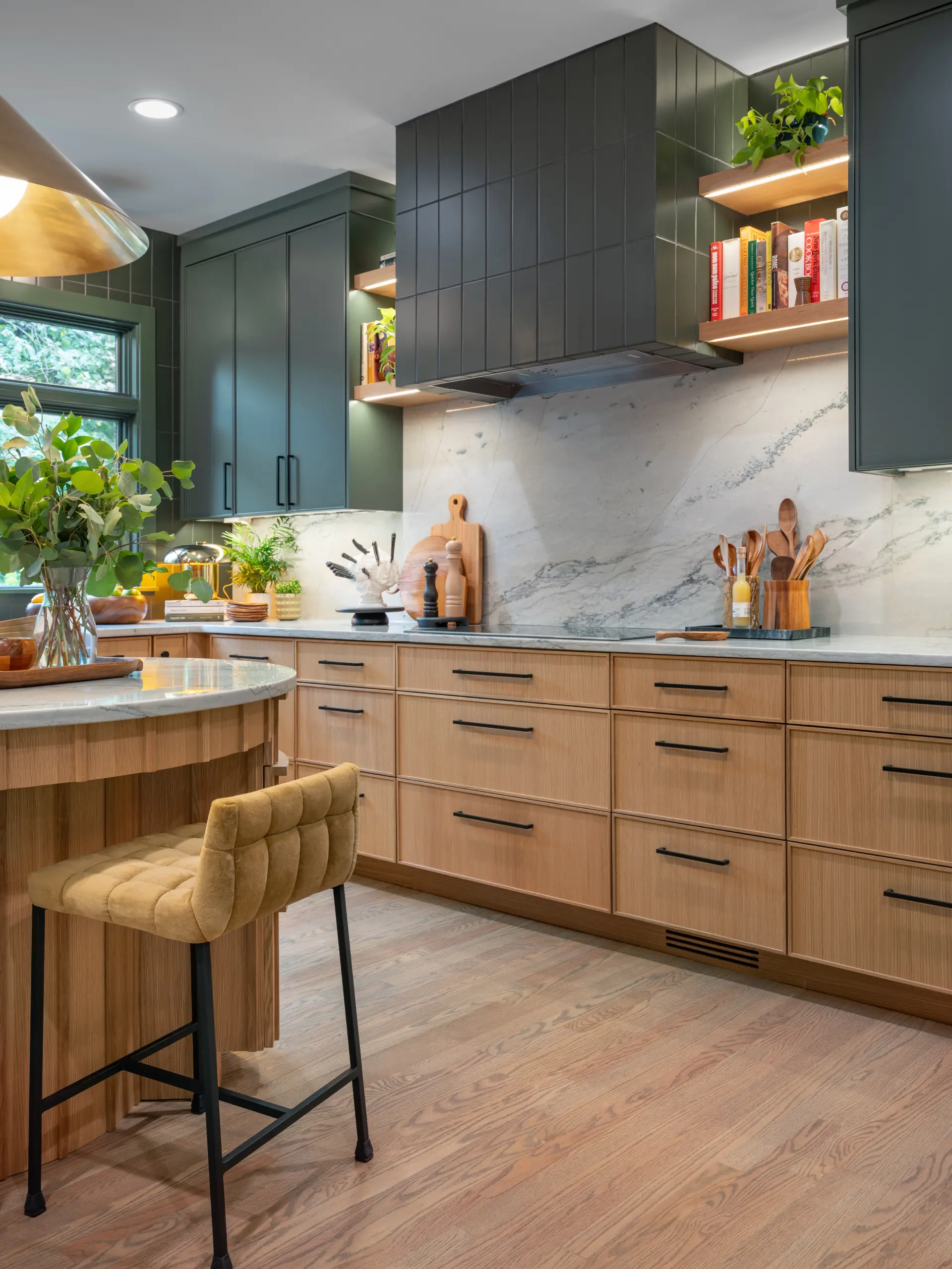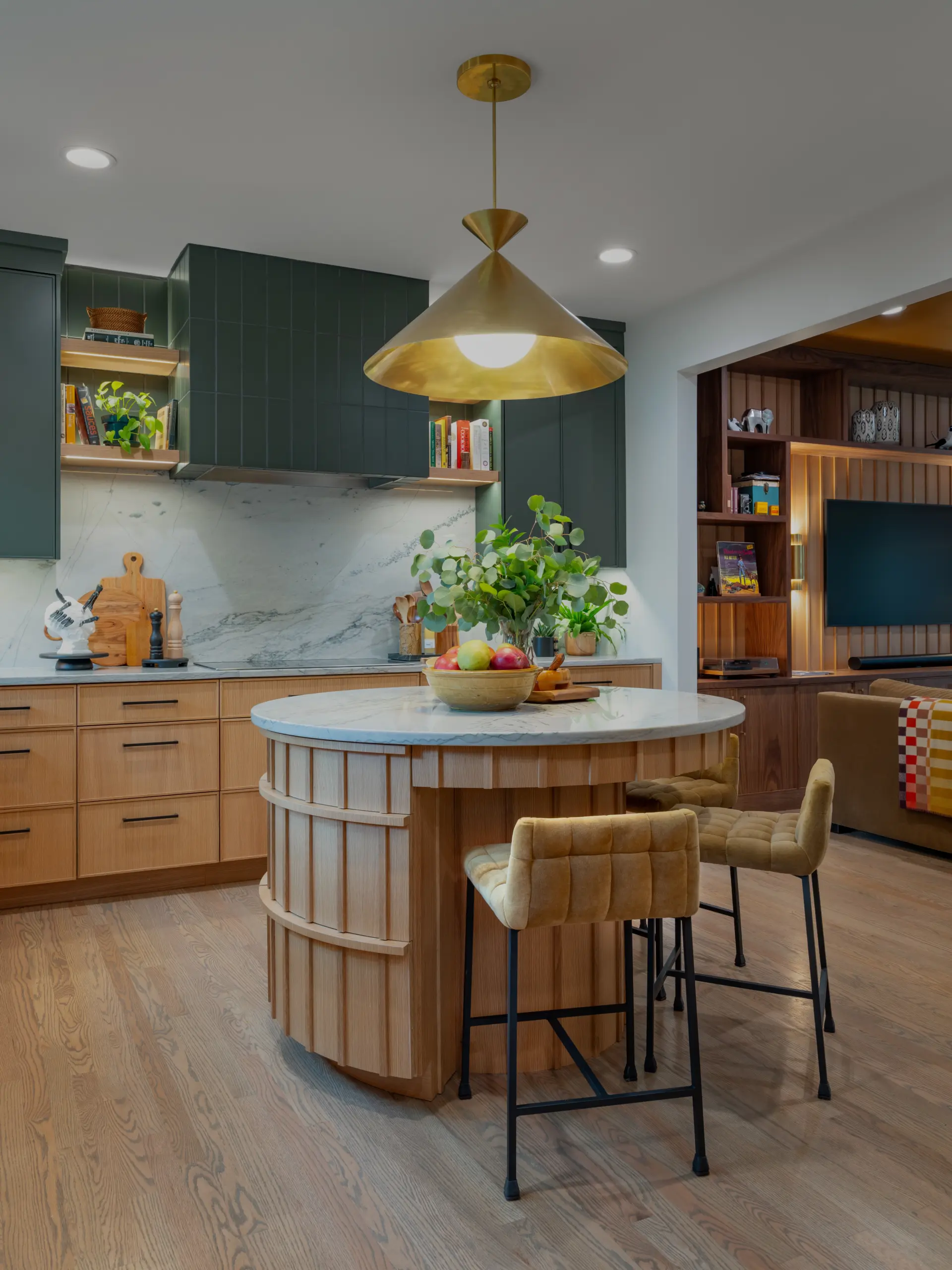 At the heart of the kitchen, a sculptural round island creates a natural gathering point. Wrapped in vertical wood detailing and topped with soft-veined stone, the island balances visual impact with practical storage solutions built directly into the curved base. Surrounding cabinetry features clean-lined white oak paired with rich green finishes, creating contrast while maintaining a calm, grounded palette.