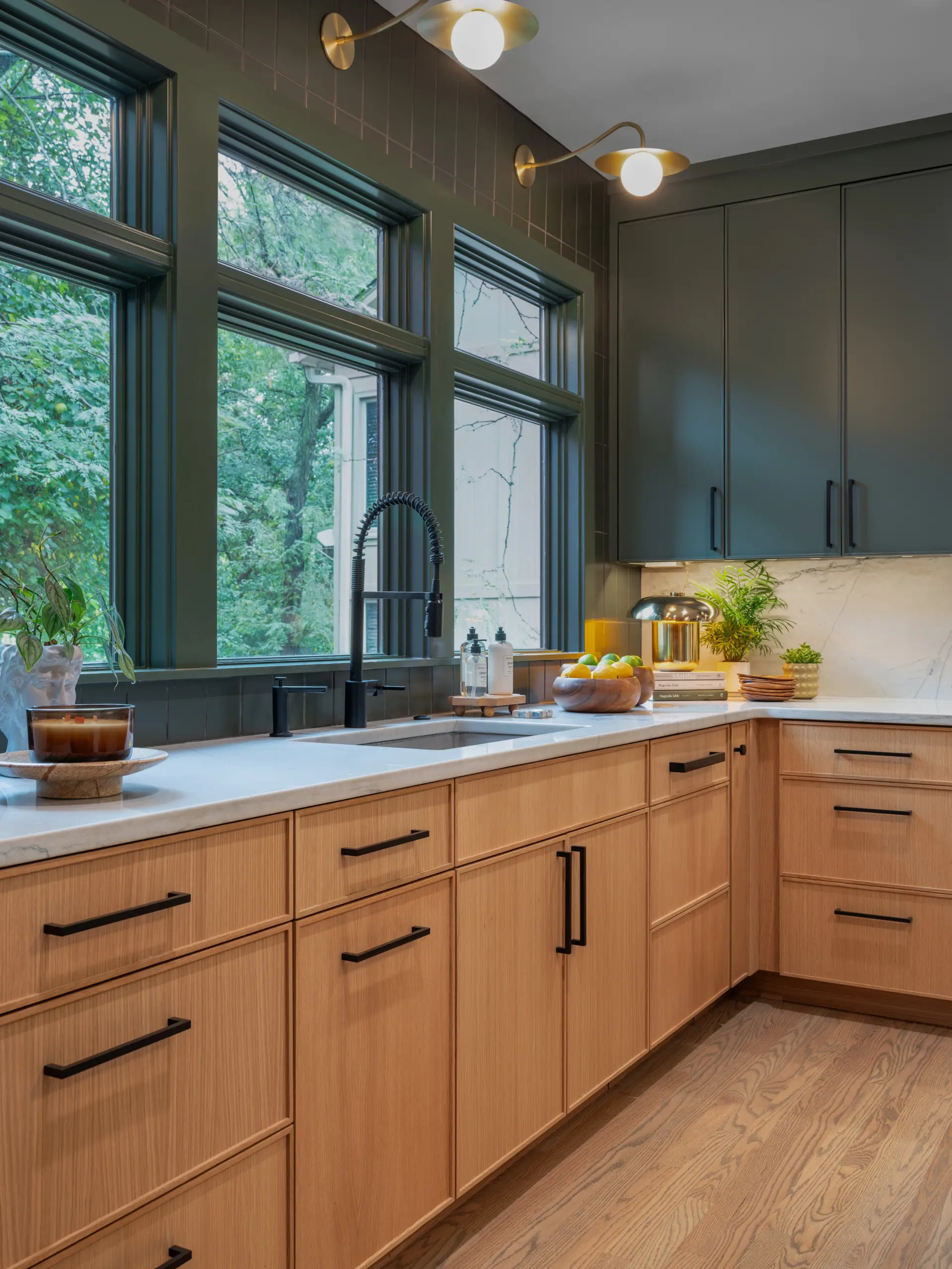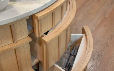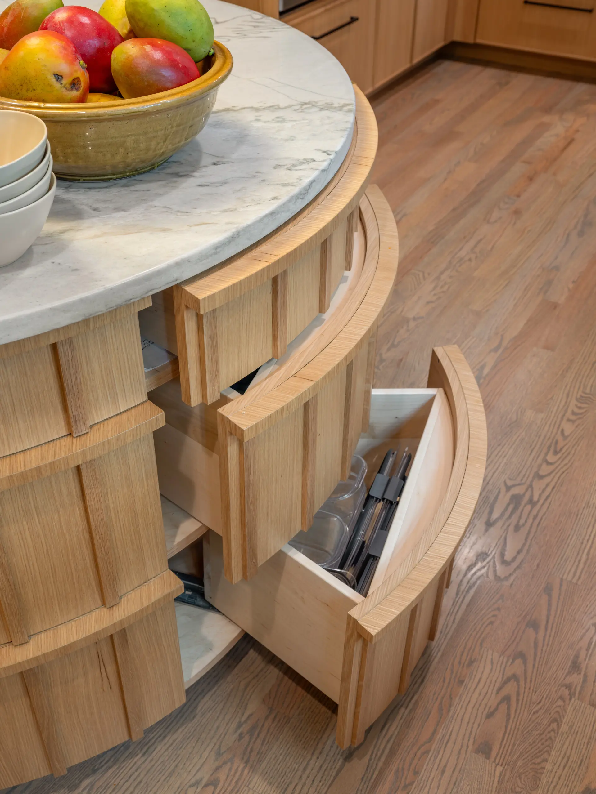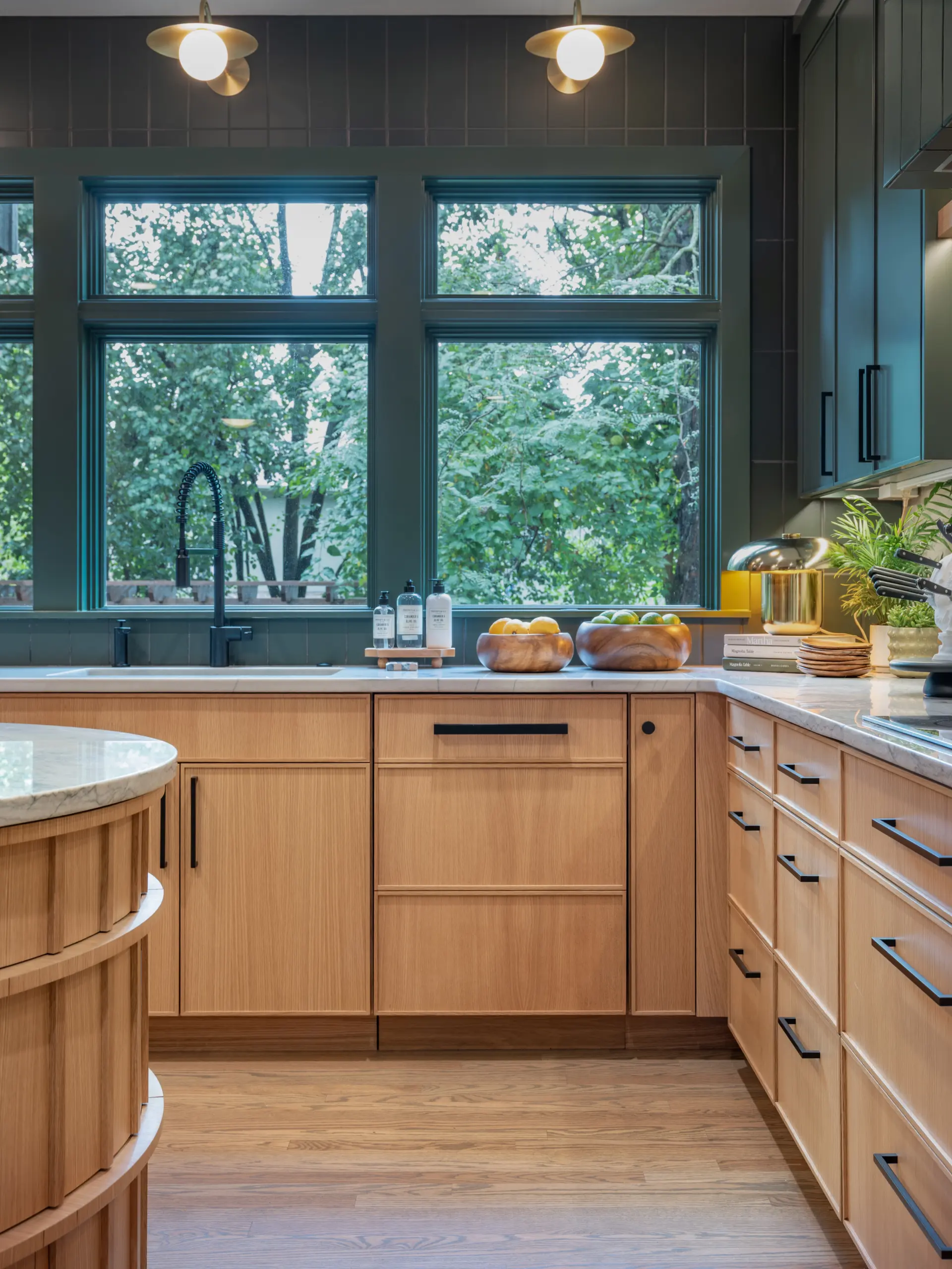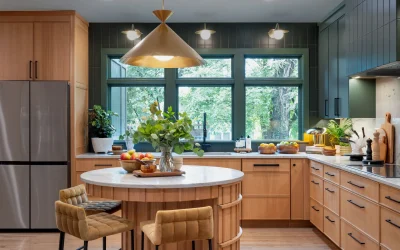 At the heart of the kitchen, a sculptural round island creates a natural gathering point. Wrapped in vertical wood detailing and topped with soft-veined stone, the island balances visual impact with practical storage solutions built directly into the curved base. Surrounding cabinetry features clean-lined white oak paired with rich green finishes, creating contrast while maintaining a calm, grounded palette.
