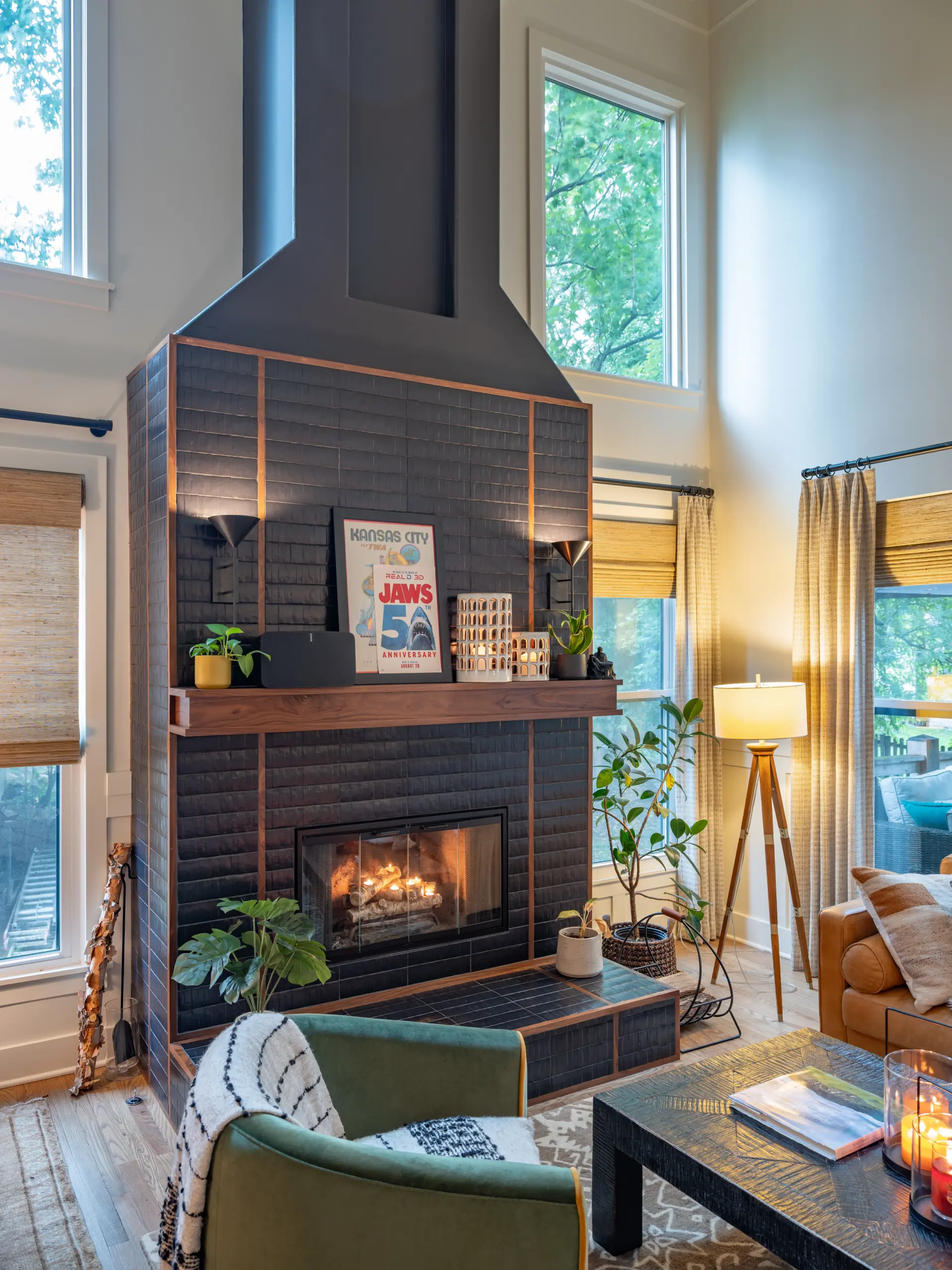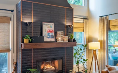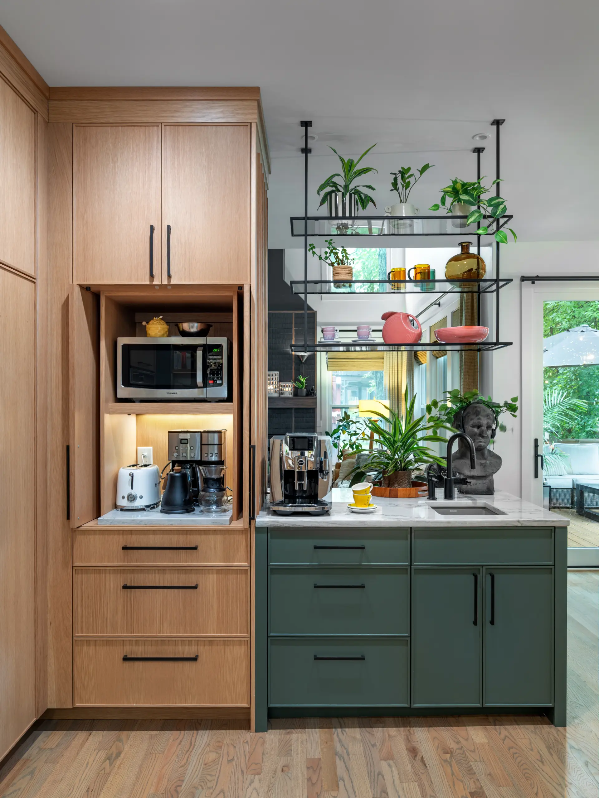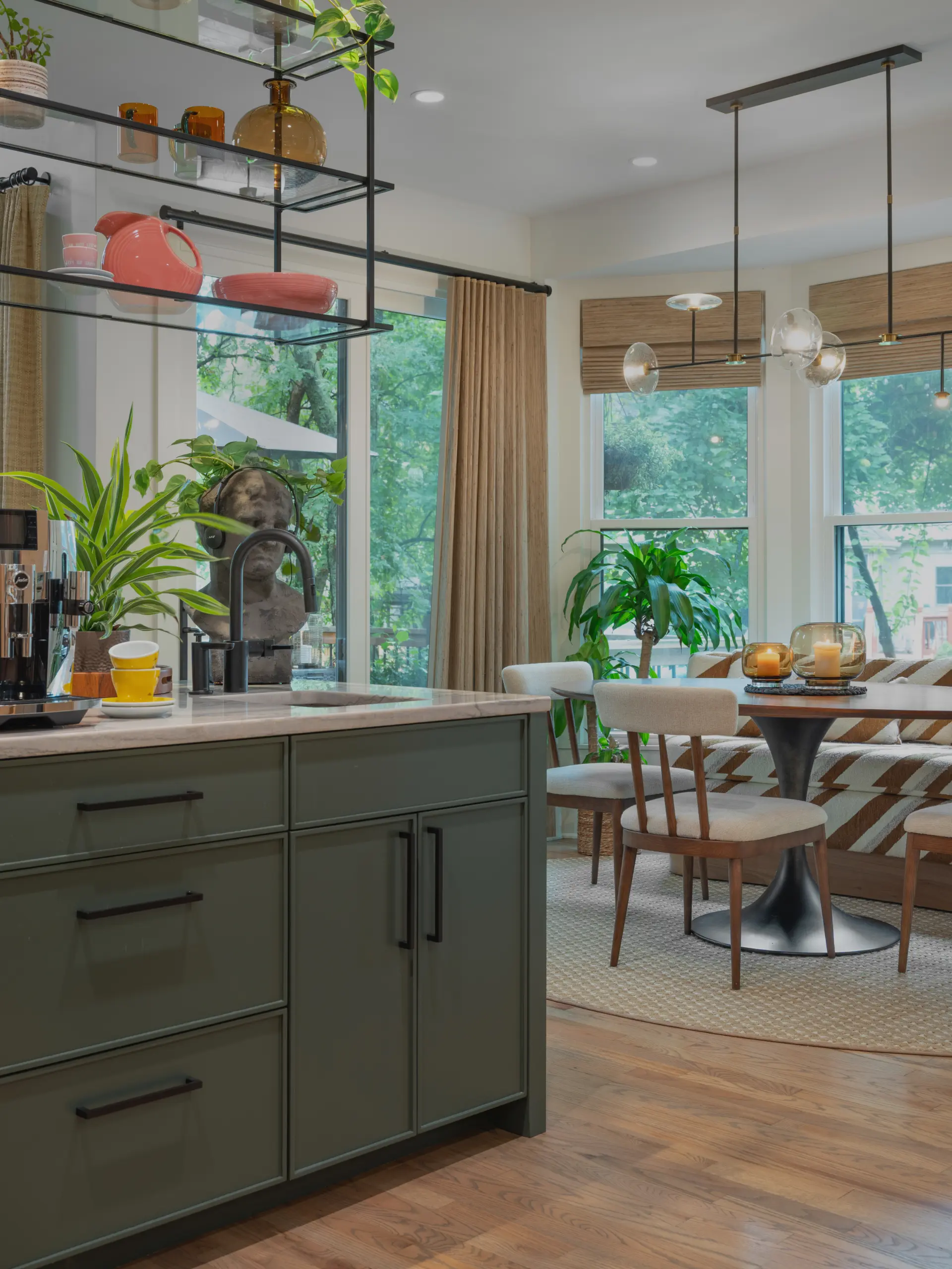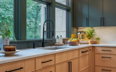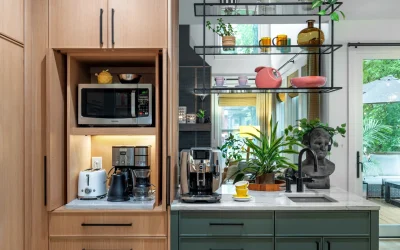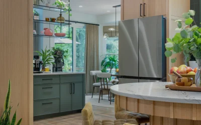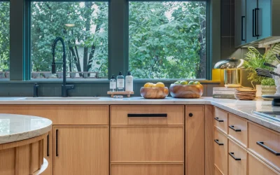 Custom millwork plays a defining role throughout the remodel. A full wall of integrated storage, open shelving with integrated lighting, and a striking range hood clad in textured tile bring architectural presence to the kitchen without overwhelming the space. Expansive windows frame wooded views and flood the room with natural light, reinforcing the connection between interior design and the surrounding landscape.