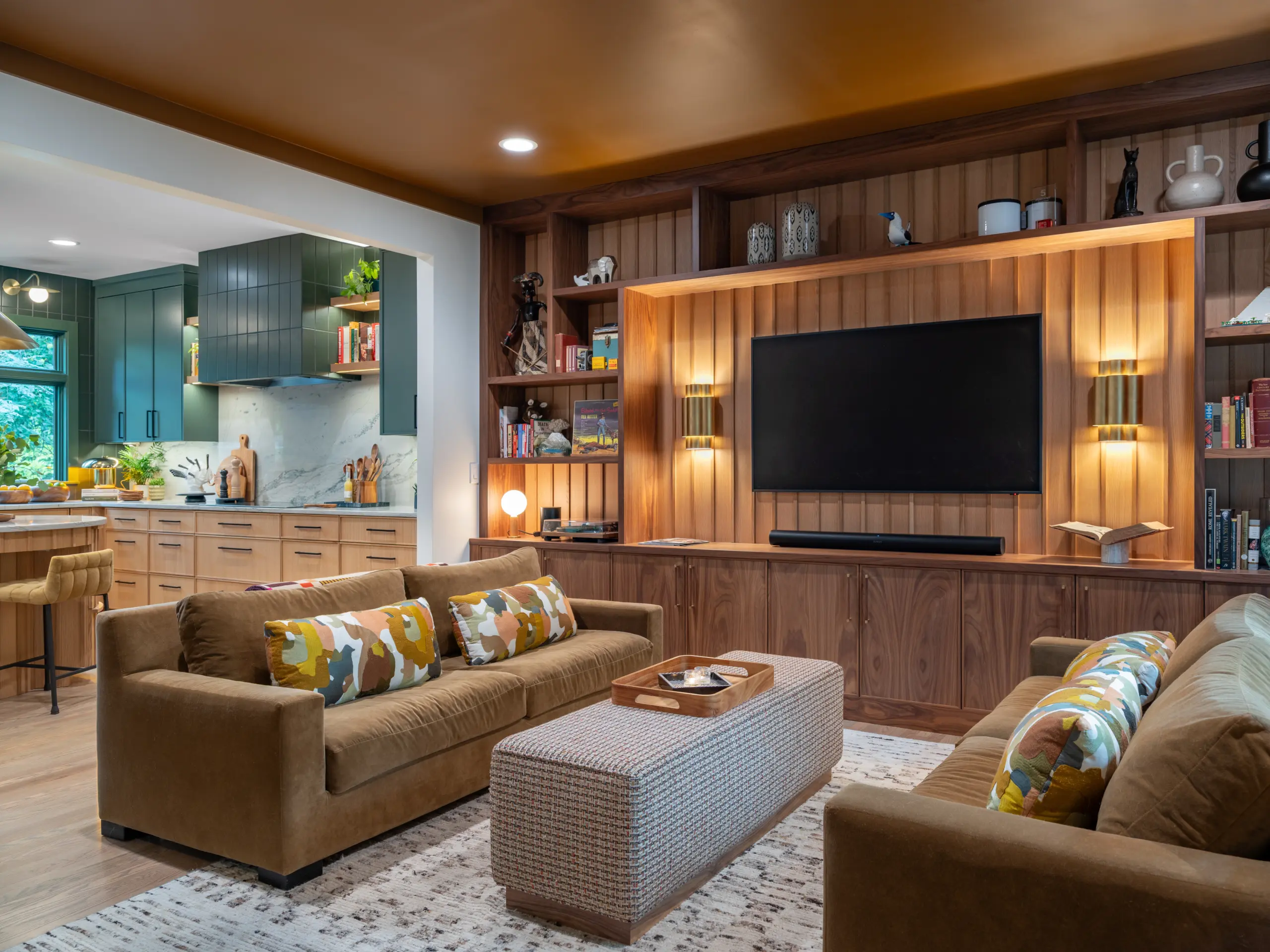 This Overland Park kitchen and living space remodel was designed to feel intentional, warm, and deeply functional for everyday living and entertaining. The renovation transforms multiple connected areas of the home into one cohesive environment built around custom cabinetry, layered materials, and modern organic design.