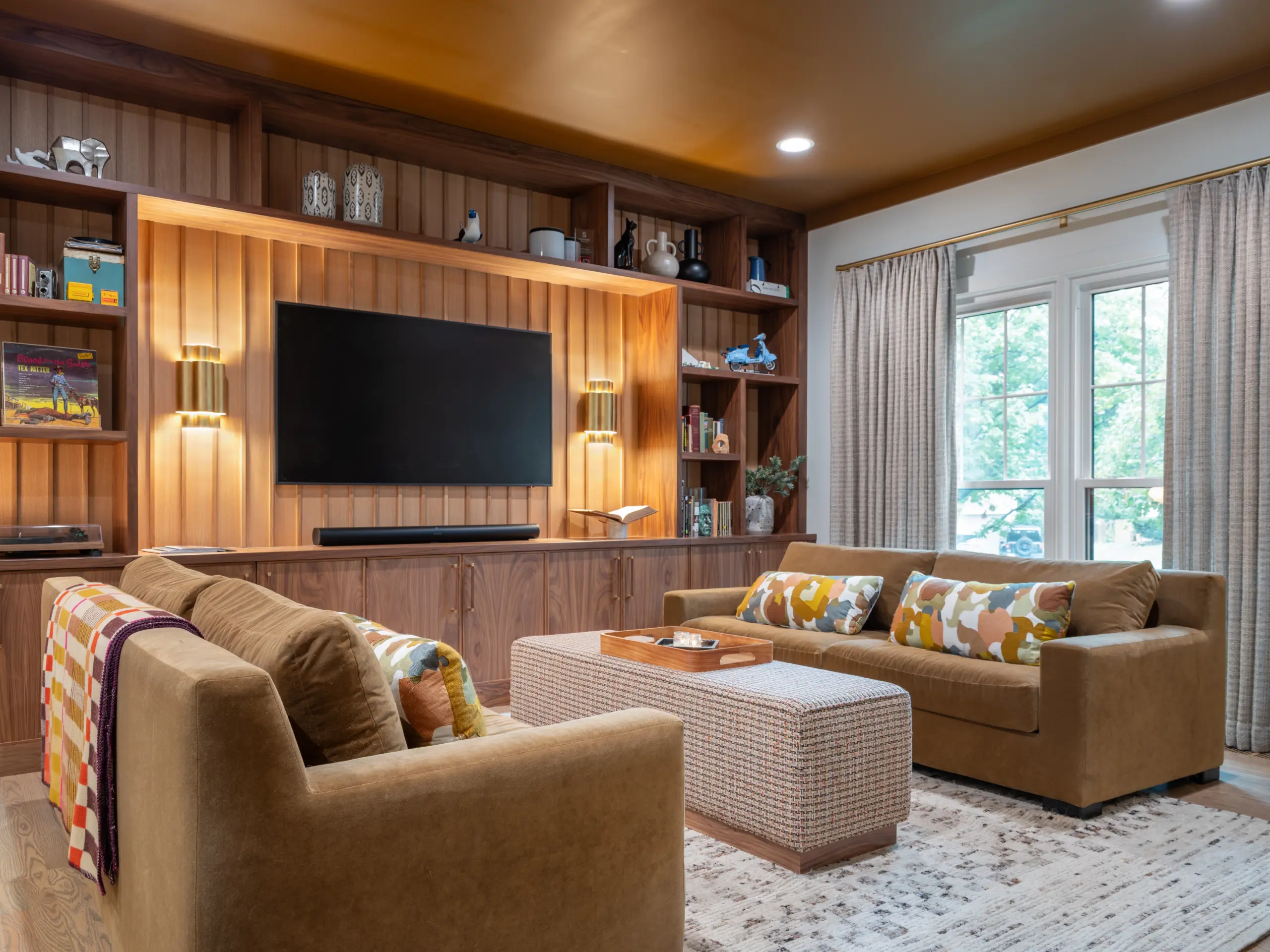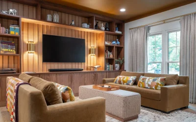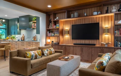 Beyond the kitchen, the renovation continues into a reimagined living area anchored by a dramatic fireplace feature wall and built-in entertainment cabinetry. Vertical wood slat detailing, warm lighting accents, and tailored shelving transform the room into a refined yet comfortable retreat ideal for both quiet evenings and hosting guests.