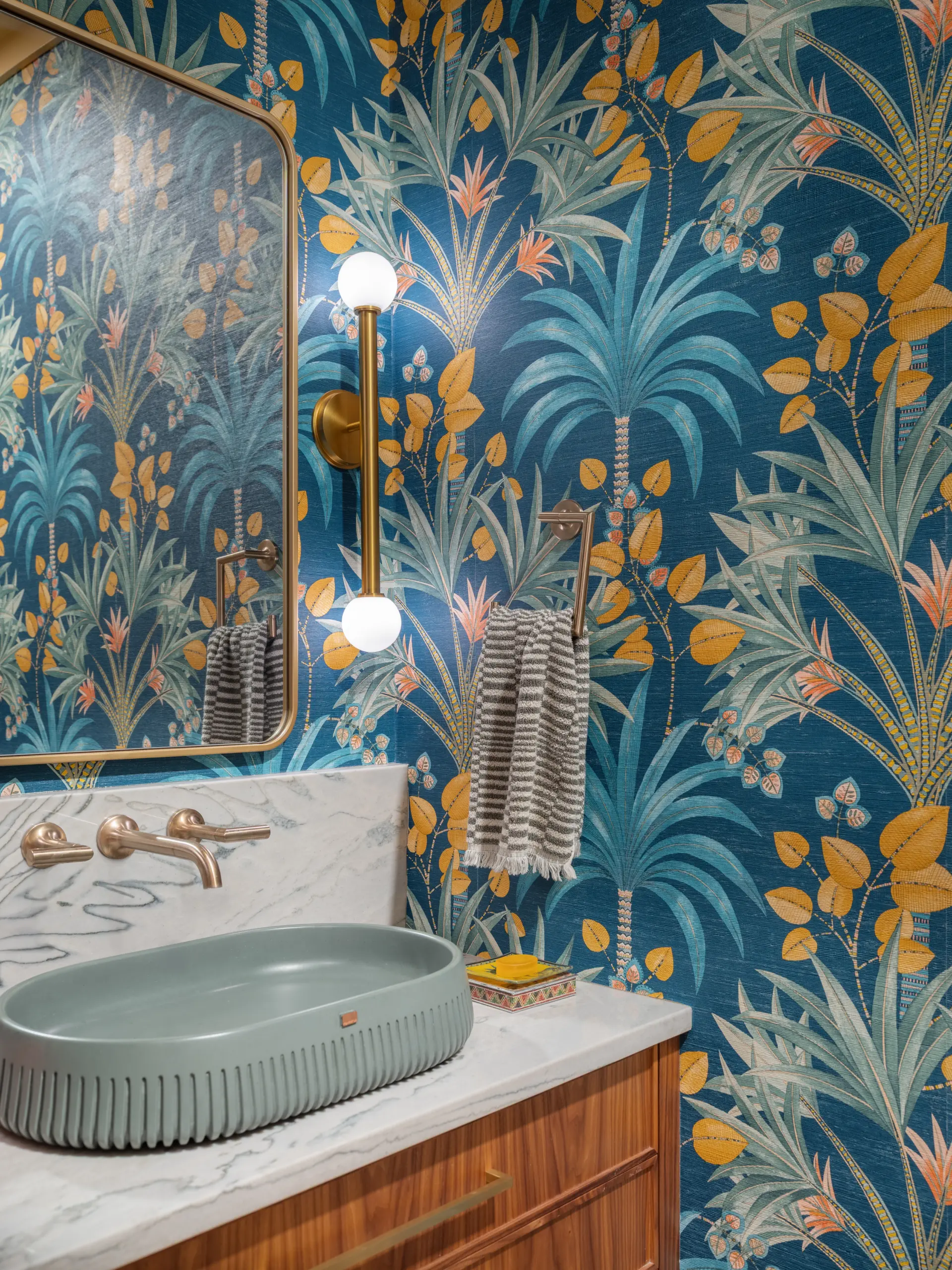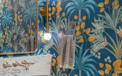 Additional highlights include a statement powder bathroom with bold patterned wallpaper, custom vanity detailing, and brass fixtures that add personality and depth. Throughout the home, updated lighting selections, wide-plank hardwood flooring, and thoughtful layout improvements work together to elevate both aesthetics and long-term functionality.